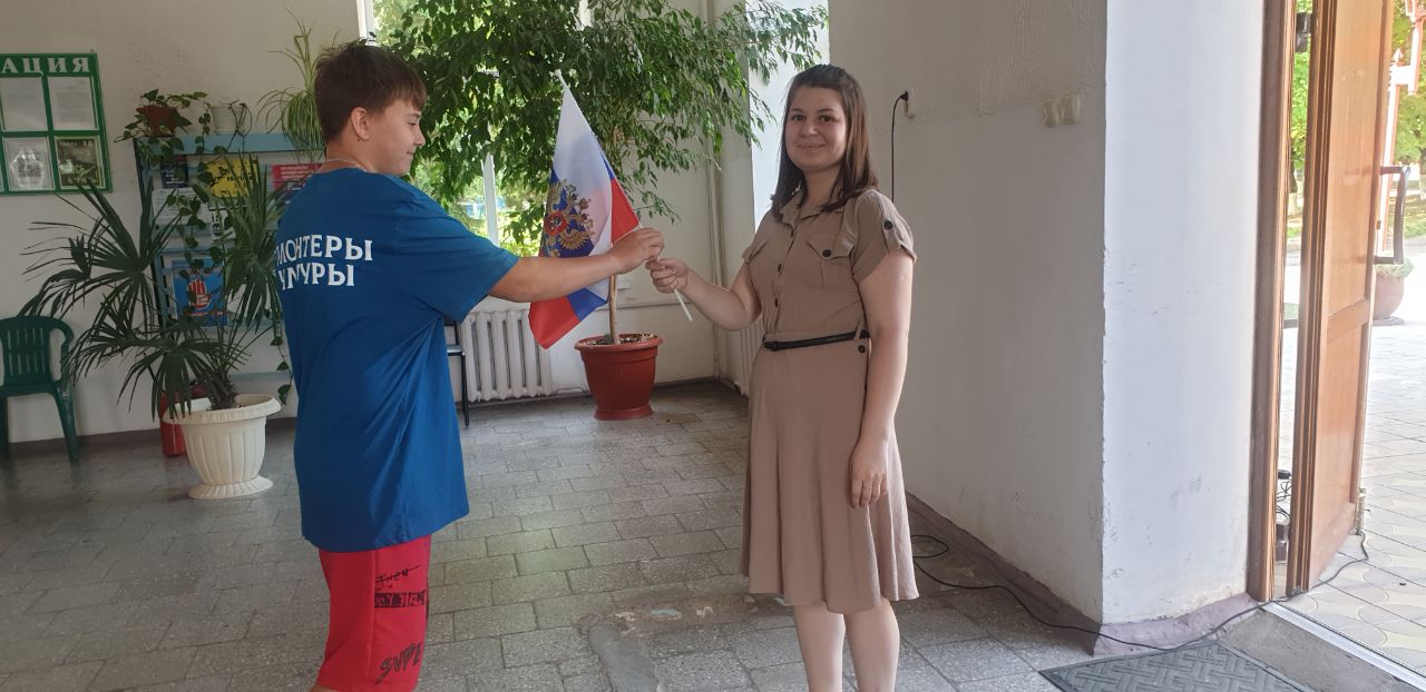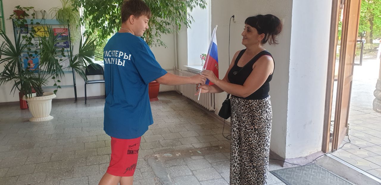 Всех гостей в фойе встречали волонтеры культуры и вручали ленты российского триколора.