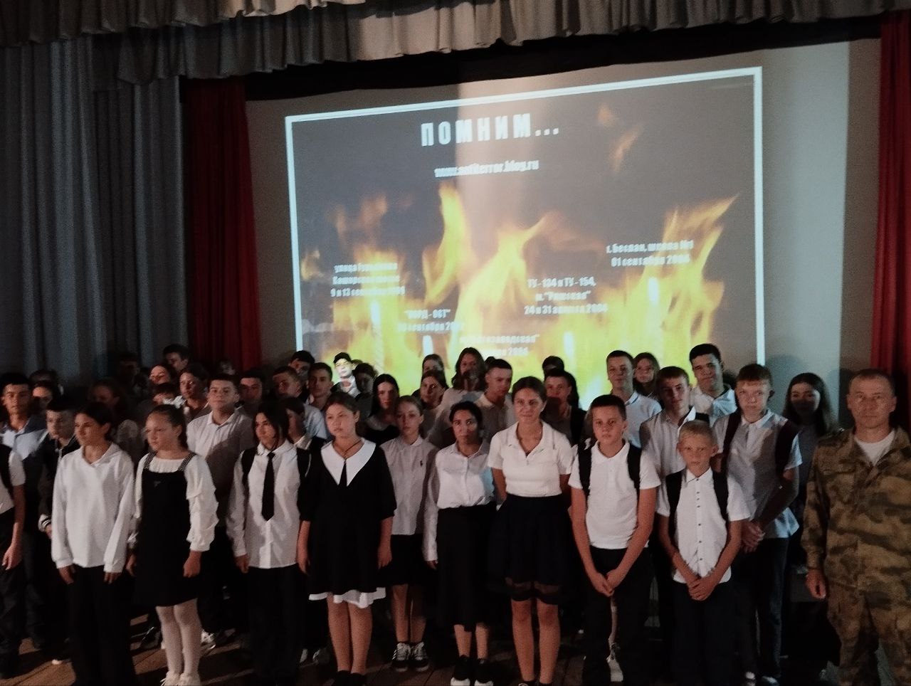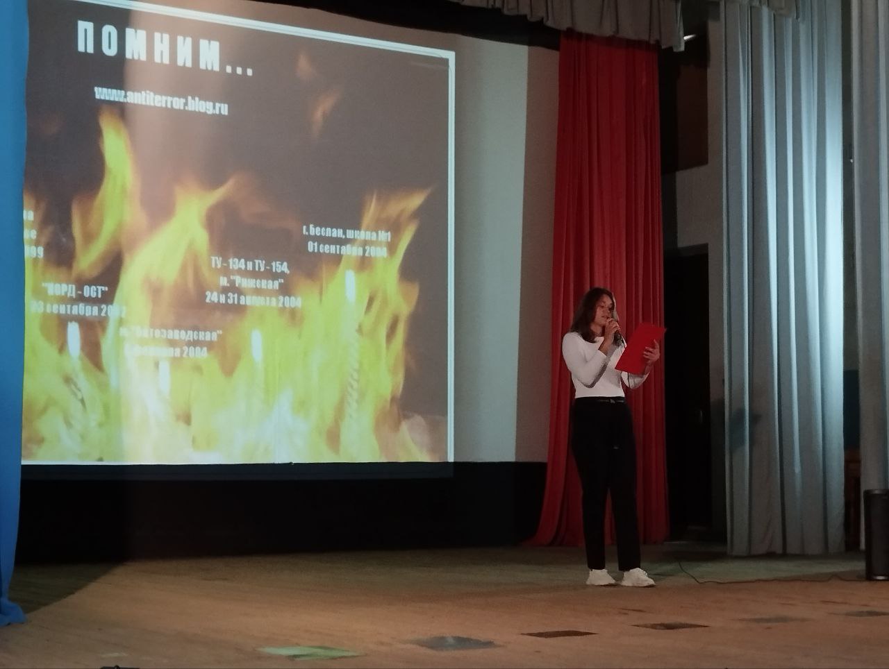 Ведущий, Давыдов Денис, рассказал о жестокости и бесчеловечности террористов, об отваге и мужестве спецназа, учителей, о страхе детей. Учащиеся узнали, что такое терроризм, его виды, каковы его цели.