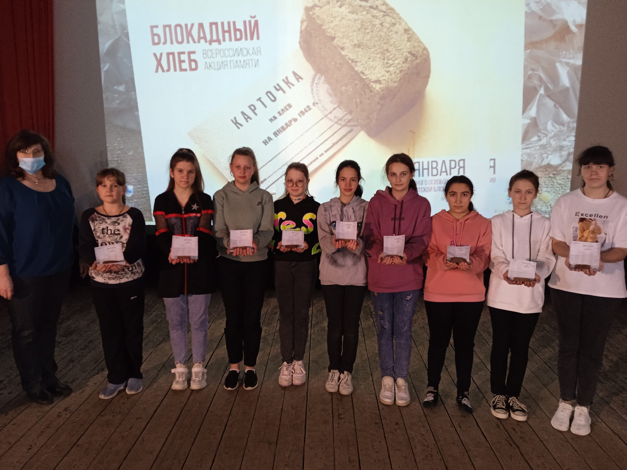 27 января День полного снятия советскими войсками блокады Ленинграда. В этот день сотрудники Дома культуры провели информационную программу «Страшные дни», в рамках Всероссийской акции памяти «Блокадный хлеб».Во время мероприятия ребятам рассказали о жизни людей во время войны, как работали хлебозаводы, из чего пекли хлеб и почему его называют «блокадным». «Блокадный хлеб — маленькие, черные кусочки , цена такой пайки стоила целой жизни. Всем участникам вручили по хлебной карточке, утеря которой стоила жизни. Акция «Блокадный хлеб» организованна для воспитания патриотизма, для того, чтобы напомнить, как ленинградцы выживали в тяжелых условиях войны, чтобы почтить память тех, кто погиб в блокадном Ленинграде. Самая главная задача для нас- помнить, какой ценой досталась Победа, рассказать об этом нашим потомкам.